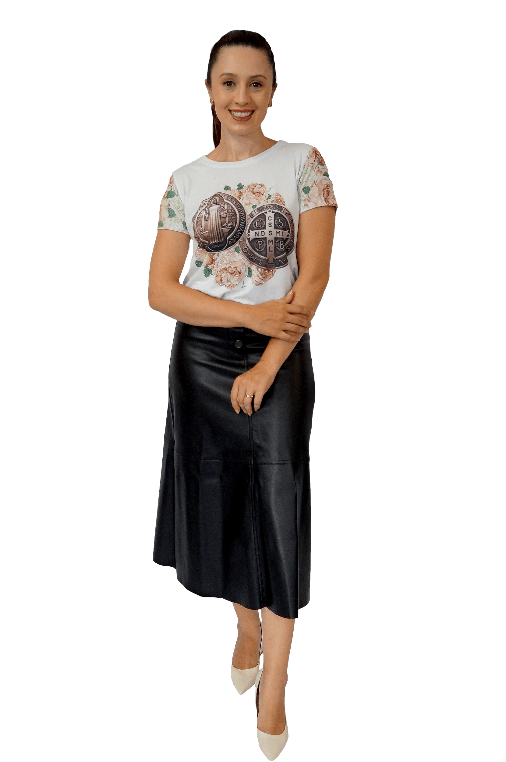 Esta T-shirt combina elegância e fé, oferecendo um design sofisticado inspirado na moda católica. Com sua modelagem princesa, ela valoriza o estilo feminino com um toque delicado e refinado.