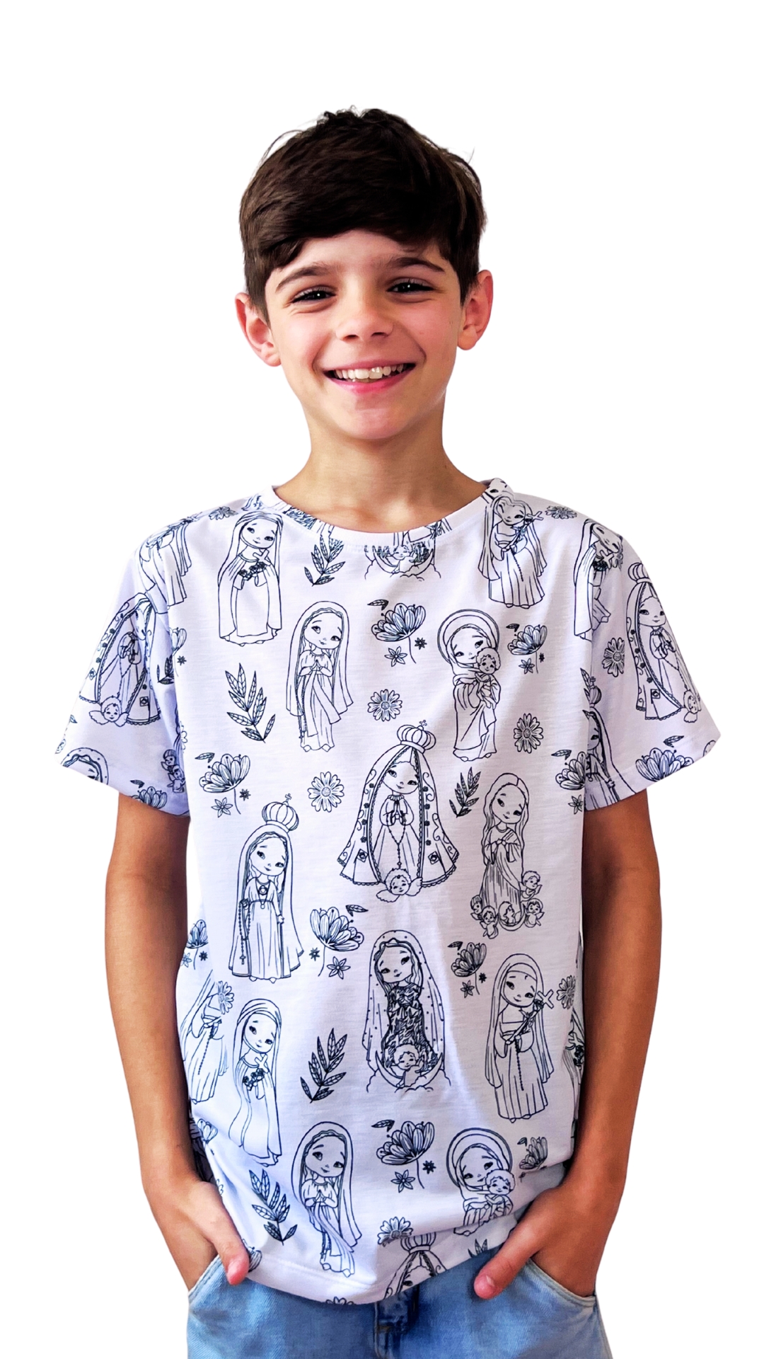 Nossa camiseta infantil em tecido Poliplex foi criada especialmente para a moda católica, unindo conforto, qualidade e um propósito educativo.